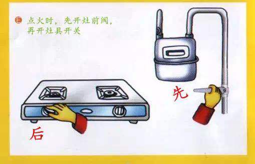 4、点火时,先开灶前阀,再开灶具开关,一次点火失败时应立即关闭开关。